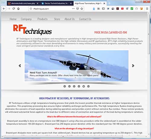 RF Techniques, Inc., which has been recently acquired by Electro Technik Industries, Inc., has now been certified to ISO 9001: 2015 by SAI Global. All of the Electro Technik Industries, Inc. subsidiaries at all locations, are approved to the most current ISO: 9001 quality standards by independent certifying bodies.